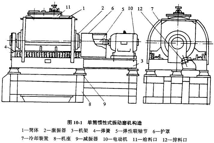 單筒慣性式振動磨機的構造如圖10-1所示。筒體l內裝有粉磨介質及物料,筒體支承在機架3廠的彈簧4上。在筒體的中心部沿軸線方向嵌有帶水套的鋼管,冷卻水連續流過水套以冷卻筒體。鋼管就是激振器的外壁,激振器的偏心袖支承在裝在管端的兩個球面滾動軸承上。當激振器由電動機10通過彈性聯軸節5帶動旋轉時,由于慣性離心力的作用,使得支承在彈簧上的筒體產生振動,磨內的介質也跟著振動。在振動頻率低的情況下,介質與介質之間緊密接觸.一層層的按一個方向。‘起運動.彼此之間沒有相互位移。當振動頻率升高時,加速度增大,介質運動激烈,備介質問的空隙擴大,介質在筒體內幾乎呈懸浮狀態,引起介質自轉、拋動及相互沖擊。夾在介質中間的物料受到沖擊和磨剝作用而粉碎。為了減少傳給基礎的動載荷,在機座8和機架3之間安有減振器9,筒體上設有給料口11,下部沒有排料口12。振動磨根據需要,可以干磨也可以濕磨,可以間歇作業,也可以連續作業。當連續磨料時,與分級裝置組成閉路循環作業。圖10-2所示為振動磨工作原理圖。